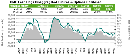 Entre le 8 et 14 juillet, les spéculateur ont acheté 3825 contrats au net ce qui représente l’une des plus grosse augmentation depuis le début du printemps. Leur position reste minime à 10,480 contrats net acheteur, on pourrait donc voir une vague d’achat si la tendance haussière qui commence se maintient pendant quelques temps.