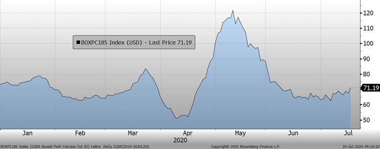 Après un mois d’inactivité pour le prix cash US, oscillant entre 45 et 46 cents/lb, le prix s’est apprécié ces 6 dernières publications pour gagner 2.43 cents. Ce n’est pas grand-chose, mais ce qui est encourageant est la nouvelle direction du cash qui est haussier et le marché semble y croire puisque les contrats d’août se transigeait à 53 cents vendredi versus l’indice CME à 47.55 cents. Le prix de la découpe a terminé la semaine sur une bonne note, en hausse de 3.84 cents vendredi, à 71.19 cents, le plus haut prix depuis 5 semaines. Le prix du jambon fait la différence lequel se transigeait dans les 40 cents/lb en juin et qui avoisine présentement 70 cents/lb. Mercredi à 15h00, l’USDA publiera le rapport Cold Storage et on aura plus d’information sur la situation des différentes coupes à ce moment.
