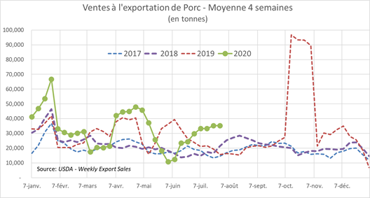 Les ventes à l'exportation de porc des États-Unis pour la semaine se terminant le 13 juillet se sont chiffrées à 39 592 tonnes, en hausse par rapport à 31 816 la semaine précédente et en avance sur la moyenne de 4 semaines de 35 200 tonnes. Les engagements totaux pour 2020 ont atteint 1.395 million de tonnes, le niveau le plus élevé jamais enregistré pour cette période de l'année. L'année dernière, à cette époque, ils avaient atteint 987 000 tonnes et la moyenne quinquennale est de 794 000 tonnes. La Chine était le plus gros acheteur avec 17 775 tonnes, suivie du Mexique avec 15 388 tonnes.
