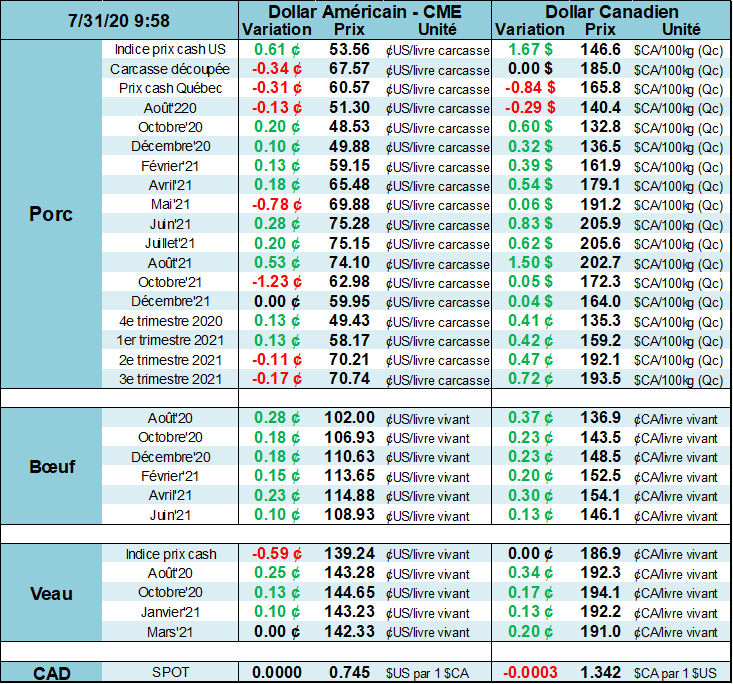 La découpe de porc de l'USDA, publiée après la clôture hier, s'est établie à 67,17 $, en baisse de 13 cents par rapport à 67,30 $ mercredi et par rapport à 68,69 $ la semaine précédente. Il s'agissait du plus bas prix des découpes depuis le 16 juillet. L'indice CME au 28 juillet était de 52.95 cents/lb, contre 51.10 la session précédente et 49.42 la semaine dernière. L'abattage de porcs estimé par l'USDA s'est élevé hier à 475 000 têtes. Cela porte le total de la semaine jusqu'à présent à 1.882 million de têtes, en hausse par rapport à 1.861 million il y a un an. La production réelle de porc aux États-Unis pour la semaine se terminant le 18 juillet s'est établie à 533,3 millions de livres, maintenant en hausse de 11.4% par rapport à il y a un an et c’est cette abondance qui semble inquiété le marché.