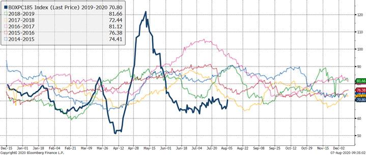 Les exportations du mois de juin s’établissaient à un maigre 183 millions lbs, c’est le plus petit volume livré depuis février 2016. Le Japon a acheté pour 58M lbs, suivi par la Corée du Sud à 41M lbs. Les ventes vers le Mexique étaient très décevantes à seulement 13.4M lbs et totalisent 36M depuis 3 mois ce qui étaient le volume mensuel avant la COVID. Pendant que les ventes roulaient au ralenti, les importations allait à contrecourant avec un énorme volume de 308M lbs grâce à beaucoup d’achat du Mexique et du Canada. Il faut retourner en août 2015 pour voir plus d’importation… avec autant d’importation et aussi peu d’exportation, il n’est pas surprenant que les importations nettes étaient à des niveaux pas observés depuis longtemps, soit 125M lbs importées au net.