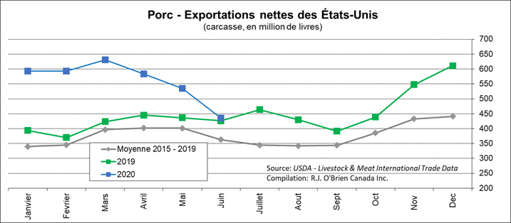 Cette semaine, autant les chiffres d’exportation du mois de juin publiés mercredi que les ventes à l’exportation de la semaine dernière, publié jeudi, étaient décevants. Les exportations de juin étaient de 515 millions lbs ce qui représente le plus petit volume vendu depuis septembre 2019. On est loin du 701 M lbs du mois de mars! Bien que la Chine demeure le plus de gros client, son volume a baissé par 83M lbs en juin pour se chiffrer à 170 M lbs. C’est tout de même plus que deux fois le volume de juin 2019, donc sur une perspective annuelle, les ventes vers la Chine sont toujours très bonnes. C’est les ventes vers le Japon qui ont grandement déçu, à seulement 75M lbs, alors qu’historiquement, c’est le deuxième meilleur acheteur. Le Mexique demeure un client stable avec +/- 100M lbs par mois au 2ème trimestre. Du côté des importations, c’est 79.2M lbs de porc qui sont entrées aux États-Unis, donc 48.2 M provenaient du Canada. Les exportations nettes (export – import) totalisaient 436 millions livres, légèrement mieux qu’en juin 2019 par 10M lbs, mais nettement moindre qu’en mai 2020 à 535M lbs.