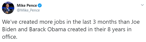 Par exemple; le mois passée aux États Unis le Vice Président de Donald Trump, Mike Pence tweetait “We’ve created more jobs in the last 3 months than Joe Biden and Barack Obama created in their 8 years in office.” Traduction: « Nous avons créé plus d’emplois au cours des trois derniers mois que Joe Biden et Barack Obama n’ont créé au cours de leurs huit années de mandat. »