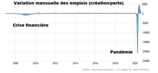 C’est une drôle manière de compter. C’est la plus forte création d’emploi de tous les temps, WOW! 2.7 millions de jobs en mai! 4.8 millions en juin! Incroyable! Fou! Encore en juillet 1.7 millions! Ça finit pu vrouuuuuuum vroooouuummm! On a créé 10 millions de job – du jamais vu! La twist? On compte la création d’emploi APRÈS les la plus grande perte jamais enregistrée. On ignore qu’ils ont perdu 22 millions d’emploi en mars-avril. On a beau créer 2 millions d’emplois par mois, mais au net c’est encore un énorme trou de 12 millions de travailleurs à la maison.