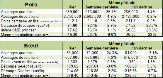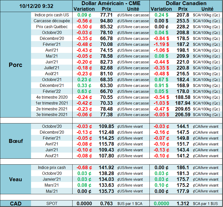 Après une forte progression la semaine dernière, le prix du porc commence à montrer des signes de stabilisation en commençant la semaine avec une légère baisse. Bien que le prix du CàT de décembre se soit apprécié par 5 cents/lb, on note que le prix des découpes en boîte a oscillé autour de 95 cents toute la semaine, sans augmentation. Même le prix cash a affiché deux publications négatives sur cinq, pour un gain net de +1 cent ce qui est bien mince à côté des gains moyens en septembre de +4 cents par semaine.
