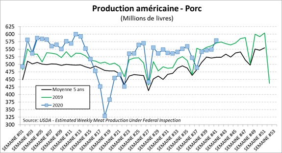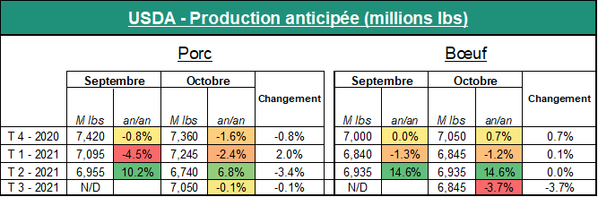 Dans le rapport WASDE de vendredi midi, l’USDA a modifié ses précisions pour le marché des viandes. Pour le 4èmetrimestre, la production de porc a légèrement été revue à la baisse sous prétexte que le poids observé est plus faible qu’anticipé antérieurement. Aussi, l’USDA a revu à la hausse la production du premier trimestre, mais à réduit ses prévisions pour le 2ème trimestre ce qui vient à s’annuler. Pour le première fois, l’USDA publie ses prévisions pour le 3ème trimestre de 2021 et prévoit une production similaire à cet été, laquelle était artificiellement gonflée par les porcs en attente. Cela représente une augmentation de 5% par rapport à l’été 2019 qui pourrait s’avérer une référence plus significative. Aussi, l’USDA a réduit ses prévisions pour la demande à l’exportation en 2021 malgré de bonnes données à court terme.