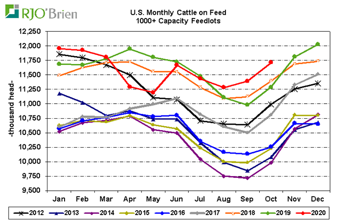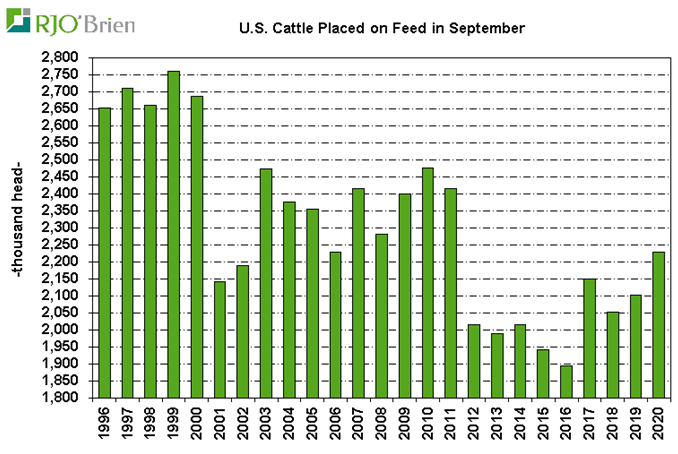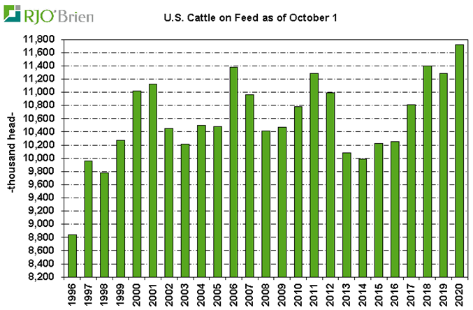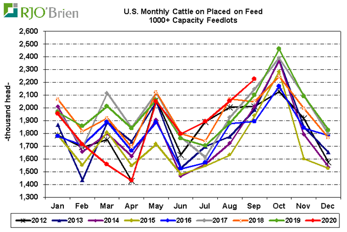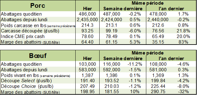 Après une semaine difficile, le prix du bœuf se stabilise malgré un rapport Cattle-on-Feed plutôt négatif pour les prix. Vendredi, l’USDA a publié un troupeau en parc de 11.717 millions têtes ce qui était dans le haut de la fourchette des estimés. C’est pratiquement le plus gros troupeau au 1er octobre depuis plus de 20 ans. La surprise était principalement au niveau des placements lesquels demeurent très élevés malgré les placements volumineux durant l’été. Près de 2.23 millions de veaux ont été placés en septembre ce qui est 5.9% de plus que l’an dernier. La commercialisation se chiffrait à 1.85 millions bœufs gras en septembre, représentant une hausse de 6.2% versus l’an dernier.