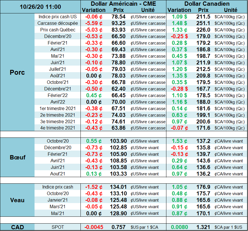 Le prix du porc de décembre connaît une autre journée sombre avec un nouveau bas pour une 3ème séance consécutive. Le prix du CàT de décembre a déjà perdu 6 cents/lb depuis les sommets de la semaine dernière maintenant que le sentiment d’optimisme s’évapore avec un prix cash qui stagne et un prix des découpes qui a perdu 6 cents la semaine dernière. Il faut dire que les spéculateurs avaient alimenté l’engouement en octobre avec une position d’achat totalisant 42,000 contrats (+4,900 entre le 14 et 20 octobre), mais à partir de maintenant, les spéculateurs pourraient mettre une pression négative sur les prix s’ils se mettent à liquider leurs positions qui deviennent graduellement à perte. En contrepartie, les éleveurs n’ont pas manqué l’opportunité des dernières semaines, cumulant près de 100,000 CàT vendus (au net) ce qui représente 35% des contrats existant soit une proportion similaire au printemps 2019.