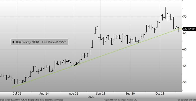 On pourrait dire que le vent à changer lorsque la Chine a annoncé la progression de son cheptel, la semaine dernière. Les échéances de 2021 baissent depuis déjà plusieurs jours après que les perspectives d’exportation sont moins bonnes et maintenant, c’est le contrat de décembre qui subit la pression des vendeurs.