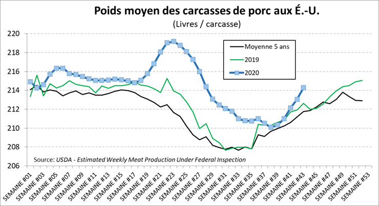 Il ne faut pas oublier que le cash est à plus de 78 cents et la découpe à 93 cents, des prix exceptionnels pour cette période de l’année. Cette situation s’explique en bonne partie par les chiffres de production qui sont nettement moindre que prévus par l’USDA. Encore cette semaine, les abattages sont légèrement sous les volumes de l’an dernier à 2.68 millions têtes (-0.4%). Ce qui est intriguant est le poids des animaux qui monte très rapidement, à 214.3 lbs/carcasse. On pourrait croire que le faible volume d’abattage et le poids qui augmente serait expliqué par des problème covideux chez les abattoirs américains, mais rien n’apparait sur le file de presse à cet effet. L’abattoir d’Olymel est cité dans les commentaires américains, comme s’il n’y avait pas de problème au sud de la frontière… L’autre hypothèse est que les éleveurs profitent des prix actuels pour engraisser les animaux le plus possible ce qui se confirmerait avec une baisse des poids si les prix cash se mettraient à baisser dans les prochaines semaines.