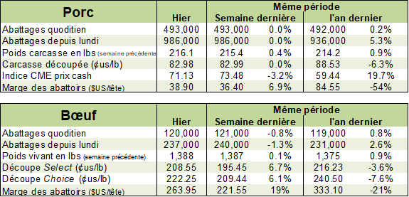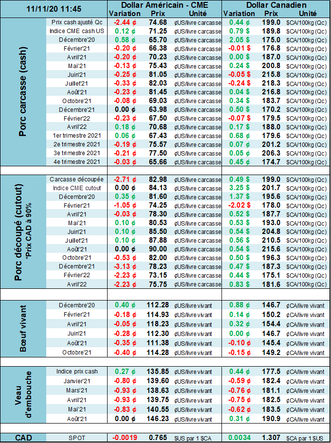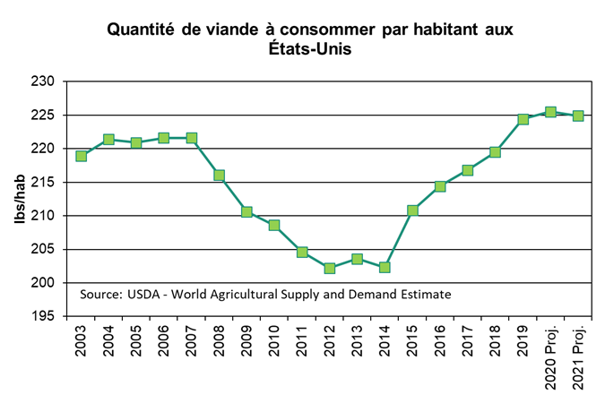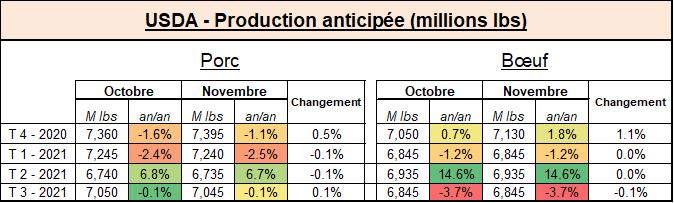 Les prévisions pour le total de la viande rouge et de la volaille en 2020, la production est augmentée par rapport au mois dernier en raison d’une production plus élevée de bœuf, de porc et de poulet de rôtisserie. La production de bœuf est augmentée par rapport au mois précédent en raison d'abattages plus élevés de bovin. Les prévisions de production de porc sont augmentées suite à l’accélération du rythme des abattages. Les prévisions de production de poulets de chair sont augmentées en raison d'une production plus élevée prévue pour le quatrième trimestre. La production de dinde est pratiquement inchangée, car la production a augmenté au troisième trimestre fût en grande partie compensée par une prévision à la baisse pour le quatrième trimestre.