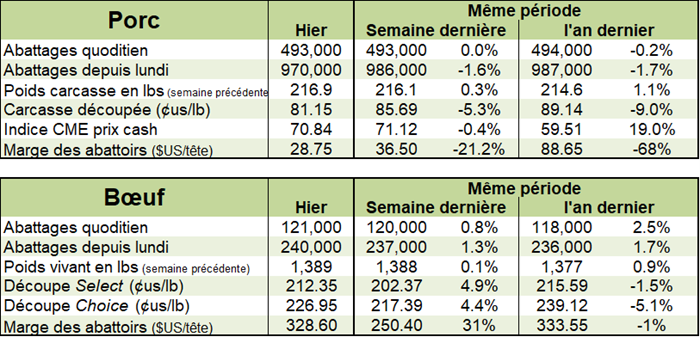 Parlant des exportations, le USDA rapportait que les Américains avaient vendu 28 900 tonnes métriques de viande de porc sur les marchés étrangers. La Chine n’avait acquis que 2100 tonnes métrique du total se plaçant en 5ieme place de la liste des importateurs. Le Mexique (8700 tonnes), le Canada (5100 tonnes) et la Corée du Sud (5000 tonnes) occupent les 3 premières places. En finalité, le total des ventes est correct sans plus; rien d’excitant, mais rien de décevant.