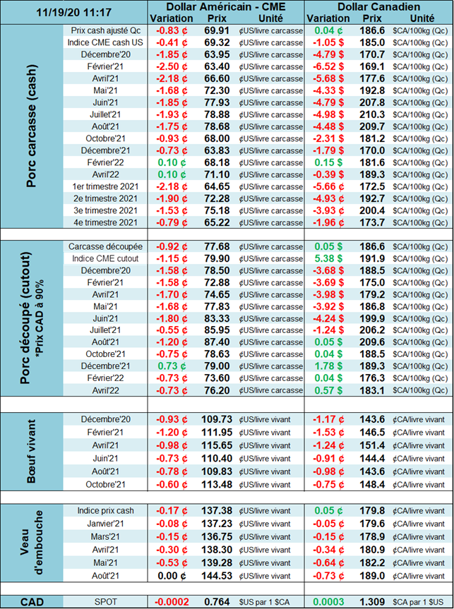 Les contrats à terme de porc continuent de prendre l’eau avec des baisses ce matin, et ce, enregistrées sur toutes les échéances. Les Etats-Unis continuent d’enregistrer une hausse importante des cas de Covid-19 dans la population en général et la crainte demeure que certains travailleurs dans les abattoirs puissent être contaminés. La Chine ne fera pas de quartier aux Américains si jamais on devait avoir une multiplication des cas de covid dans les abattoirs; une fermeture des frontières pourrait bien suivre ou à tout le moins une réduction des exportations de viande de porcs américains vers la Chine.