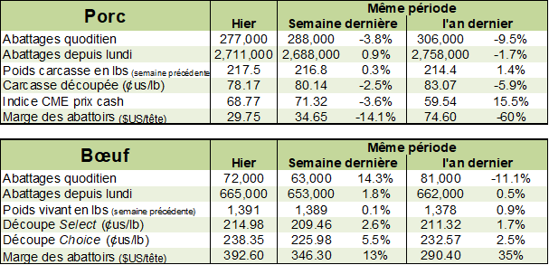 La semaine dernière, les abattages étaient de 2.71 millions têtes, ce qui représente 1% de plus que la semaine dernière, mais 2 % de moins que l’an dernier à pareille date. Cependant, le poids ne cesse d’augmenter avec une moyenne de 217.5 lbs/carcasse, en hausse de +0.7 lbs versus la semaine dernière. L’augmentation de poids reflète une augmentation de +1.4% sur la production de porc. De la sorte, la production de la semaine dernière affichait seulement un déficit de -0.6% versus l’an dernier avec 590 millions de livres.