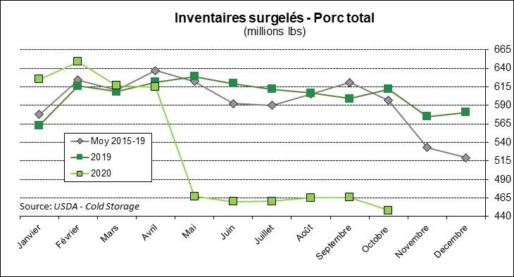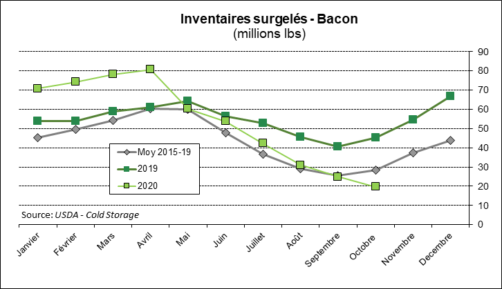 Dans un autre ordre d’idée, le USDA a publié les inventaires de viandes conservées dans les congélateurs américains. Le résultat demeure très surprenant. Les inventaires de viande de porc se situent à 448.2 millions de livres en baisse de 26,8% par rapport à 2019 et en baisse de 25% sous la moyenne des inventaires des 5 dernières années. C’est encore une fois majeure comme changement, mais cela semble être une nouvelle réalité. Les exportations furent très fortes en octobre et justifient à elles seules une réduction des inventaires. Deux points à noter; les inventaires de jambon sont aussi en baisse de 29,1% par rapport l’an dernier alors que le bacon se situe 56,7% sous le niveau de 2019.
