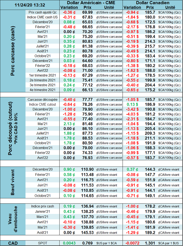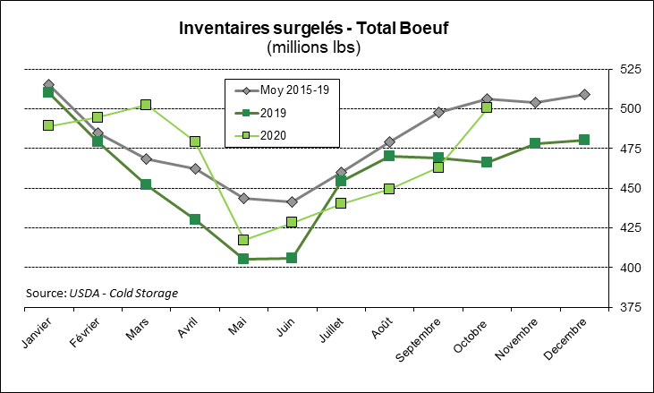Quant aux inventaires de viandes de bœuf, les inventaires ont grimpé de 7,3% en octobre. C’est tout de même un niveau sous la moyenne des 5 dernières années de 1,1%. Ces inventaires seront intéressants à suivre au cours de l’hiver puisque que les exportations sont en forte hausses depuis 2 semaines et que les placements de veaux dans les parcs sont plus faibles que prévu. Serait-il possible que les conditions sèches dans les Plaines américaines et que la hausse des couts d’alimentation pour les bœufs soient deux facteurs de réduction possible de la production en 2021?