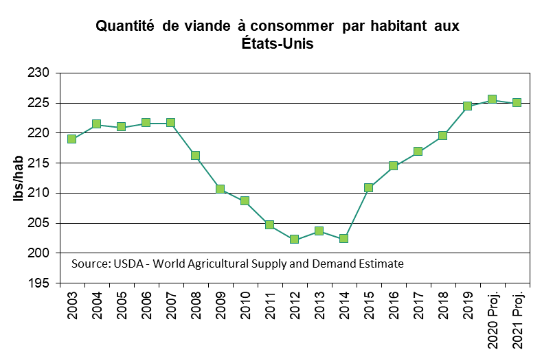 Le problème (2019 et 2020) pour le prix des viandes depuis quelques mois ce n’est pas tant la demande, mais l’offre en Amérique du Nord qui fut trop abondante. Le USDA rapporte que pour chaque consommateur, l’offre représentait plus de 225 livres ce qui constitue une offre record ou presque. La difficulté pour enregistrer des hausse de prix vient tout simplement de ce simple fait. Par conséquent, si l’offre globale diminue, normalement on peut suspecter une hausse des prix à venir (rappelez vous cours d’économie 101 – offre et demande!)