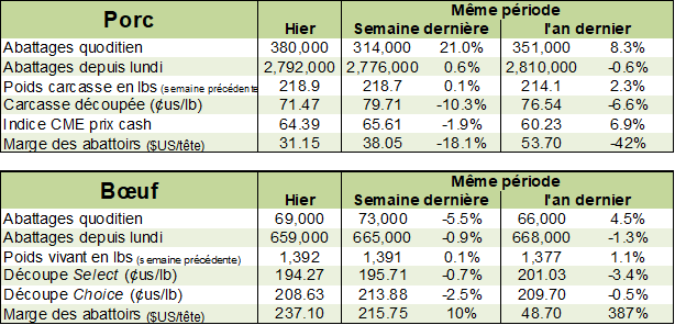 Les abattages de la semaine dernière totalisaient 2.79 millions de porcs, c’est 1.1% de plus que la semaine précédente, mais 1.2% de moins que l’an dernier. Malgré des abattages plus faible, c’est le poids des animaux qui continue de surprendre puisqu’on atteint des niveaux similaires au printemps dernier, à presque 219lbs/carcasse. Avec 2.3% plus de viande par animal, la production s’est établie à 611 millions lbs, en hausse de +1.1% versus l’an dernier.