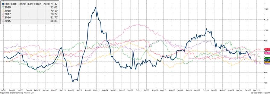 Sur le marché du porc, on note une faiblesse au comptant depuis l’échéance des contrats de décembre. En 4 jours, le cutout a baissé de 5.5 cents/lb et le cash a diminué de -3.30 cents. Il faut dire que depuis 2014, le prix cash est dans le haut des dernières années (pour cette période de l’année) alors que le cutout est dans le bas de la fourchette de la fin décembre, c’est donc un environnement plus difficile financièrement pour les abattoirs américaines comparativement aux années précédentes. De la sorte, des baisses de prix supplémentaires sur la carcasse découpée pourrait très bien amener le prix cash dans le bas des 60 cents la livre. Pendant ce temps, les marchés boursiers restent indifférents puisque l’échéance la plus rapprochée est dans 2 mois, soit à la mi-février, laissant amplement de temps pour voir un revirement de situation.