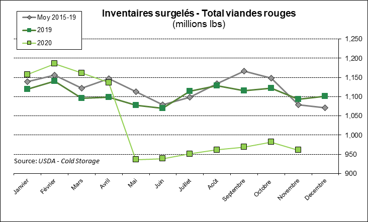 Le rapport de Cold Storage est aussi sorti hier en fin de journée et la quantité de viande détenues dans les congélateurs américains sont encore relativement faibles par rapport aux normes historiques. Au 30 novembre 2020, les inventaires de viande de porcs se situaient à 414.13 millions de livres c’est 28% de moins que la quantité de l’an dernier. Nos savons que depuis mars dernier, nous vivons dans une nouvelle réalité concernant les inventaires de viandes. La chaines d’apprivoisement s’est peut-être écourtée certains entrepôts qui accumulaient du porc sont peut-être devenus caduques. Il a probablement moins de zone d’entrepôts pour acheminer cette viande aux consommateurs. Avec les restaurants fermés, la viande est principalement détenu par des supermarchés et certains transformateurs qui veulent davantage acheter du frais. Par contre, en cas de problèmes d’abattages il y aura peu de marge de manœuvre et cette situation pourrait engendrer une nouvelle volatilité dans le prix et surtout sur la découpe. Il faudra être à l’affut des opportunités en tant que producteurs pour gérer ce prix éventuellement.