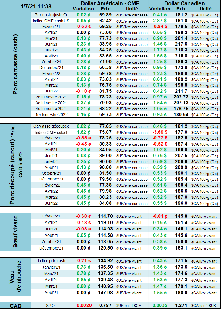 Du côté des abattoirs américains, Smithfield Foods prépare activement une campagne de vaccination à l’usine pour ses employées ce qui devrait diminuer les problèmes d’absentéisme et augmenter sa main d’œuvre disponible. Du côté de Tyson Food, on annonce le retour de son abattoir en Iowa (à Columbus Junction) qui a été fermé pendant 3 semaines en raison de problèmes mécaniques sur la chaine d’abattage. De la sorte, on devrait se retrouver avec de moins en moins de pression sur la livraison des porcs et possiblement que le poids des carcasses pourrait baisser.