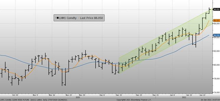 Depuis 5 séances, les prix des contrats d’été ont rebondi par 5 cents la livre et font un nouveau sommet depuis 4 jours consécutifs. On ne se le cachera pas, l’analyse technique est « bullish » présentement sur le marché du porc, à l’exception du mois de février qui ne parvient pas à briser la résistance de 70 cents. Il n’y a pas de nouvelles spécifiques qui explique ce rallye, on voit que la demande est bonne avec un rebond du prix cash et le prix du bœuf qui augmente, mais somme toute, je ne vois pas de nouveau élément choc. Sur le fils de presse, on parle beaucoup du cas de PPA en Chine, le premier depuis des mois, mais le prix du contrat chinois n’a même pas augmenté sur la nouvelle. C’est donc étrange qu’on ait une montée plus forte aux É.-U. qu’en Chine fasse à une baisse potentiel de la production chinoise, bien qu’on est encore loin d’une situation incontrôlable.