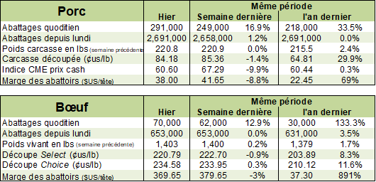 Depuis 2015, le prix de la découpe de porc est pratiquement à un sommet pour cette période de l’année, en ligne avec 2017, oscillant autour de 85 cents la livre. Pourtant, ce n’est pas l’offre de viande qui manque aux États-Unis avec des abattages à 2.70 millions de porcs la semaine dernière, à la hausse de +0.7% versus l’an dernier. Le poids continue d’être extrêmement élevé à 221 lbs/carcasse, un record. Il ne faut pas oublier qu’on ne inclue pas le poids de la tête sur la carcasse américaine, ça reviendrait donc à un poids moyen de 239 lbs/carcasse au Québec ou 108.4 kg. En somme, la production était plus élevée par +3.2% à 594.2 millions de livres.