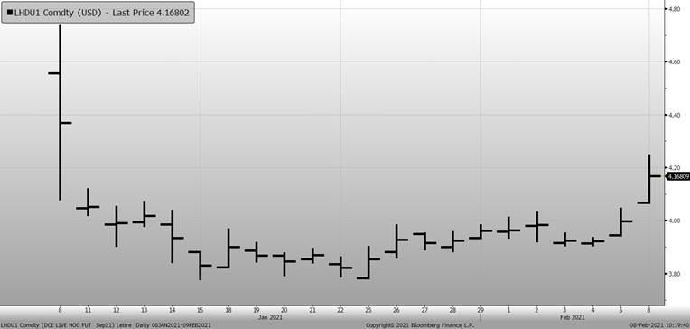 Le prix du porc monte légèrement ce matin, après une nuit mouvementée sur la bourse chinoise. Depuis l’existence du contrat à terme en Chine, le prix a connu sa plus forte augmentation cette nuit avec un gain jusqu’à 6% à certains moments, pour finir la séance avec un gain de +4.25%, à un prix équivalent à 4.16 $US/kg pour septembre 2021. La semaine dernière, on parlait déjà que la production chinoise est prise avec de nouveaux cas de PPA, DEP et fièvre aphteuse. L’ampleur des dommages est toutefois inconnue et il ne faut pas oublier que le troupeau chinois est 7x plus gros que celui des États-Unis, c’est alors difficile de quantifier l’impact de quelques cas sur la totalité d’un troupeau aussi vaste. On voit certains commentaires rapporter que 20% des truies dans le nord de la Chine seraient impacté par la nouvelle vague de PPA alors que ça serait jusqu’à 30% dans certaines région du sud. Cependant, le terme « impacté » demeure vague et il ne faut pas sauter aux conclusions trop vite. Au moins, le prix du CàT en Chine devrait refléter les anticipations du marché chinois et nous donner une meilleure idée de la situation. Puisque l’élément qui carbure la montée des prix à Chicago est en bonne partie les anticipations positives quant aux exportations américaines, il est évident que le prix des contrats en Chine sera un facteur à surveiller de près.