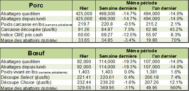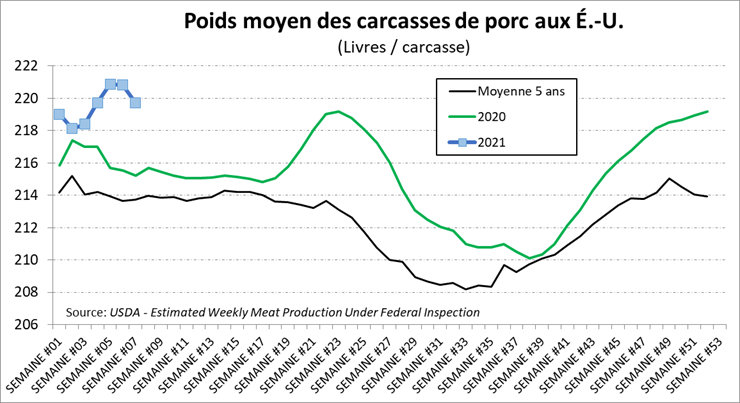 Concernant la production de viande, l’abondance demeure en place. La semaine dernière, les abattages totalisaient 2.66 millions porcs, soit 2.9% de plus que l’an dernier. À cela s’ajoute une augmentation de 2.1% à cause du poids moyen de 219.70 lbs/carcasse, soit 4.5 lbs de plus que l’an dernier à pareille date. Au total, la production hebdomadaire était de 585 millions de livres, c’est 5.0% de plus que l’an dernier ou 28 millions de plus.