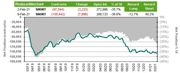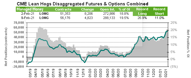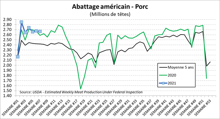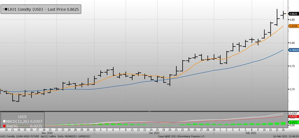 Dernièrement, on a observé beaucoup de volume sur l’échéance d’avril et c’est le contrat qui s’est le plus apprécié depuis 1 mois. Cela suggérait que les spéculateurs achetaient beaucoup de contrat de porcs, comme c’est le cas pour plusieurs matières premières. Il faut dire que plusieurs banques américaines et économistes parlent du début d’une « super-cycle » des matières premières, incitant les investisseurs à acheter des fonds qui répliquent passivement le prix d’un panier de plusieurs commodités, dont le porc. Les données du CFTC confirment que les spéculateurs détiennent une importante position laquelle continue de grossir. Entre le 3 et 9 février, les spéculateurs ont acheté près de 5,000 contrats, ce qui vient s’ajouter au 8,000 achetés la semaine précédente. En date du 9 février, ils détenaient plus de 56,000 contrats et ce chiffre va fort possible augmenter en date d’aujourd’hui. Est-ce que c’est beaucoup? En le comparant au printemps 2019, alors que les spéculateurs détenaient plus de 60,000 contrats, on peut dire que c’est presqu’un sommet en deux ans. Cependant, ce qu’il ne faut pas négliger est l’absence des éleveurs comme contrepartistes, relativement à 2019. Présentement, les éleveurs ont 105,000 contrats nets vendus versus 160,000 contrats en 2019. Au final, on voit qu’il y a moins de vendeurs présentement versus 2019, pour le même notre d’achat spéculatif. Puisque le nombre de contrats existants est nettement moindre qu’en 2019, cela fait que le poids des spéculateurs sur le marché du porc est de plus en plus important. En date du 9 février, les spéculateurs détenaient en achat l’équivalent de 19.5% de tous les contrats existants, comparativement à 13% au sommet en 2019. Avec une présence aussi forte des spéculateurs dans le marché du porc (et des matières premières en général), il faut s’attendre à de plus grands mouvements de prix ces prochains mois, autant à la hausse qu’à la baisse.