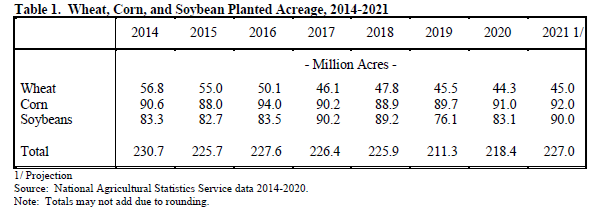 Les surfaces sont donc toutes estimées en hausses pour les trois principales cultures (Est-ce une grande surprise?). Par contre, on note que les surfaces suggérées en maïs sont un peu inférieures aux estimations initiales des agroéconomistes. Ce qu’on peut noter cependant c’est la hausse de presque de 9 millions d’acres consacrées à ces cultures. Il faut revenir en 2012 / 2013 et 2014 pour revoir un bilan total de près de 230 millions d’acres pour ces cultures. Comme quoi les prix élevés des dernières semaines (mois) attirent les producteurs vers ces cultures.