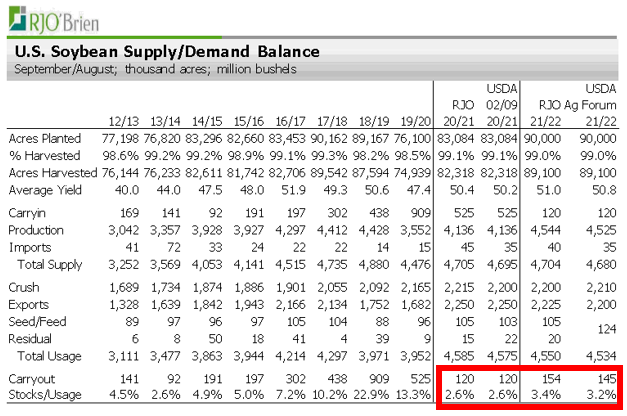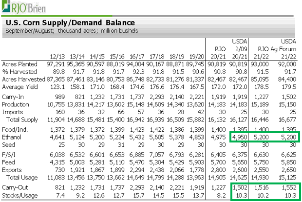 Le USDA pourra abaisser certainement la production d’éthanol éventuellement au cours de la prochaine année. Ce n’est certainement pas une industrie en croissance et celle-ci devra plutôt gérer sa décroissance au cours des prochaines années. A noter, l’enthousiasme du USDA au niveau des rendements moyens pour 2021/2022 à 179.5 boisseaux/acre! Ce chiffre constituerait un nouveau record.
