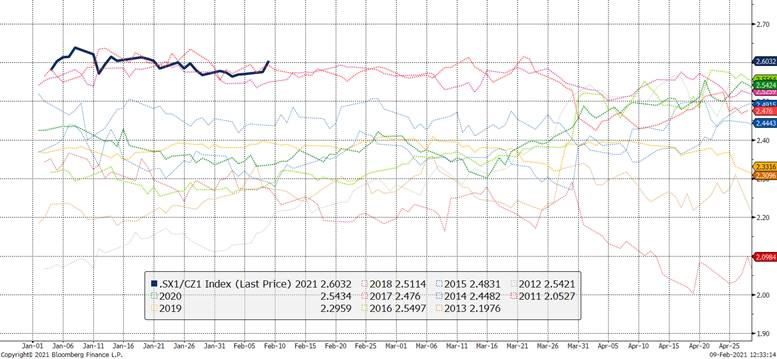 Je souhaitais aussi porter votre attention sur la ration mais/ soya (nouvelle récolte) qui est particulièrement élevé pour cette période de l’année, ce qui suggère peut-être une changement possible dans les intentions de semis. La ratio se situe près de 2.61 ce matin. Ceci signifie que le mais de décembre est sous-évalué en valeur par rapport au prix de la fève de novembre 2021. Ou simplement que le prix des fève est trop enthousiaste par rapport au maïs. C’est une réalité économique importante pour le choix de semis printaniers (bien que le plan de rotation soit un facteur non-négligeable).