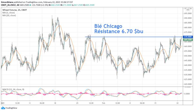 Ça fait presqu’un mois maintenant que les prix semblent se stabiliser dans le blé d’inde; ça tourne autour de 5.50 $bu et bien que la volatilité soit présente le prix cherche à rester autour de ces niveaux là quand même. Une pause avant de repartir à la hausse? Une pause avant de commencer à redescendre? J’ai un constat similaire dans les fèves, ça semble prendre une pause tout juste sous les 14$ le boisseau. Récemment c’est le blé qui montre le plus de force, notamment à cause de la potentielle réduction des exportations russes (taxe) et de la crainte de qualité avec les froids intenses la semaine dernière aux USA.