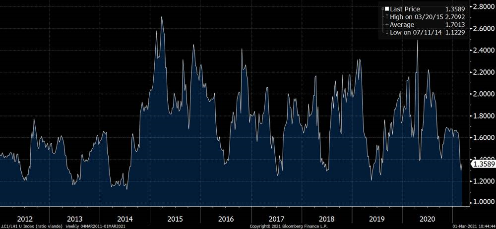 Depuis 2 mois, le prix du porc a explosé, mais ce ne fût pas le cas pour le prix des bovins. De la sorte, le ratio du prix bœuf/porc à Chicago a passé de 1.7x en novembre-décembre à 1.35x présentement. Quand on regarde les prix du juin et août, les ratios sur les contrats à terme sont à 1.23x. Comme vous pouvez voir sur le graphique ci-dessous, ce n’est pas une situation qui tend à durer très longtemps quand le ratio est inférieur à 1.40x… Depuis 10 ans, le ratio a touché un bas à 1.15x, mais en moyenne, le prix du bœuf se transige 1.70x le prix du porc. Il reste à savoir si c’est le prix du bœuf qui est faible ou le prix du porc qui est cher?