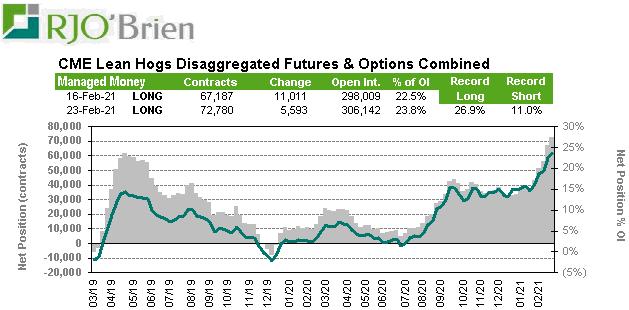 Du côté des spéculateurs, on constate qu’ils continuent toujours d’acheter des contrats. Entre le 17 et 23 février, les spéculateurs ont ajouté plus de 5,500 CàT dans leurs livres, pour une position nette de 72,780 contrats de porc, représentant une quantité de contrats similaire à avril 2014 lors de la DEP aux États-Unis. On reste tout de même sous les records historiques de 98,000 contrats achetés en 2013. En date du 23 février, les spéculateurs détenaient 24% de tous les contrats de porc en tant qu’acheteur, assez près des records historiques à 26.9%. La liquidité est un facteur important pour les spéculateurs ce qui fait en sorte que leur position est principalement sur avril et un peu sur juin. On peut s’attendre à voir les écarts de prix bouger à partir de la mi-mars puisqu’ils devront graduellement transférer leur position d’avril sur les mois d’été.