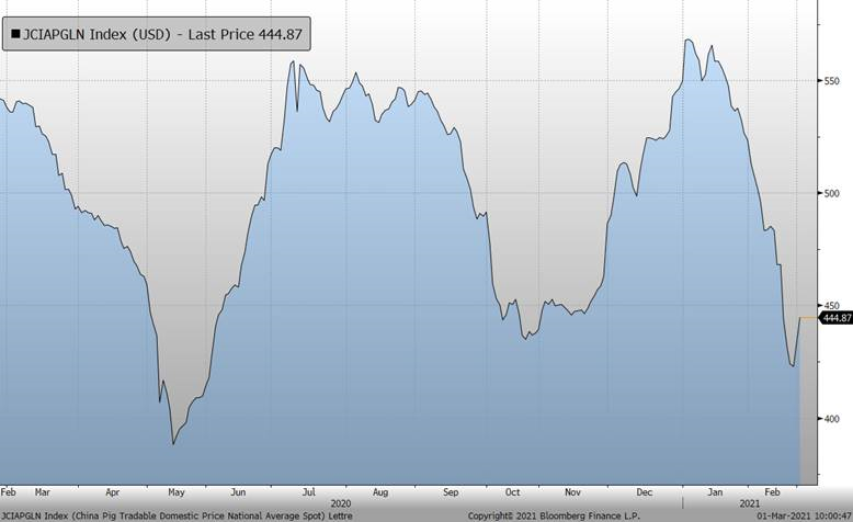 Depuis quelques jours, le marché du porc se stabilise et consolide les importants gains des dernières semaines. Les prix ont commencé à plafonner depuis les données décevantes sur les ventes à l’exportation. Cependant, l’engouement revient un peu ce matin après que le prix boursier en Chine atteigne un nouveau sommet pour les livraisons de septembre à 450 $US/100kg. Même le prix cash a rebondi par 2.75% cette nuit, à 445 $US/100kg, tout de même 100 $US/100kg de moins qu’en janvier. Ce rebond en Chine survient alors que les analystes s’inquiètent de plus en plus des maladies porcines, notamment la PPA, DEP et SRRP, qui devraient ralentir la reconstruction du cheptel. Dans la même logique, le prix du tourteau a fortement chuté depuis 2 jours.