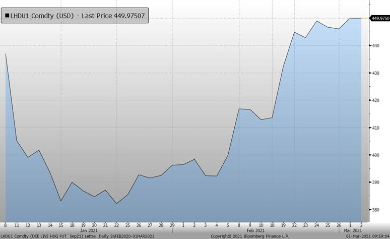 Prix du porc à Dalian en Chine, livraison sept 2021 - $US/100kg