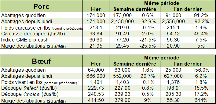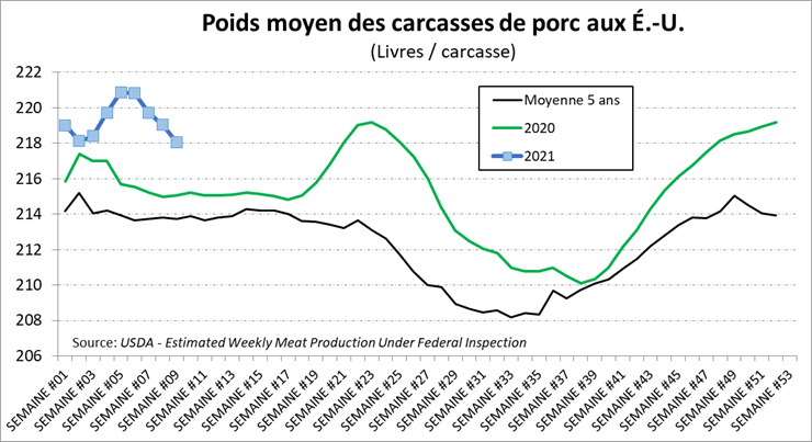 Pendant ce temps, la production de porc demeure élevée. Pour la dernière semaine de février, les abattages étaient volumineux à 2.64 millions de têtes, soit 3.2% de plus que l’an dernier. Le poids est en forte diminution depuis quelques semaines pour s’enligne éventuellement avec la moyenne. Le poids moyen était de 218 lbs/carcasse, comparativement à 221 lbs il y a 4 semaines. Au final, la production hebdomadaire était de 576.1 millions de livres, soit 8.2% et 4.6% de plus que la semaine précédente et que l’année dernière, respectivement.