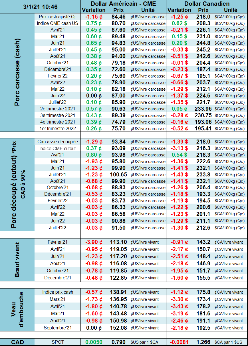Du côté des États-Unis, le prix cash continue de monter, surpassant la barre du 80 cents/lb, soit une première depuis août 2019… une triste réalité de constater que le sommet de 2020 fût seulement de 79 cents/lb. Bref, l’indice CME du prix cash surpasse la barre du 200 $CA/100kg et selon le marché à Chicago, ça devrait rester ainsi jusqu’à la mi-octobre 2021 avec le contrat à 205 $CA/100kg.