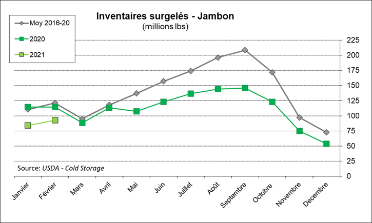 - Inventaires de porcs à 491 millions lbs : les plus élevés depuis avril 2020, mais la reconstruction est lente. Seulement +33 millions lbs en inventaire versus janvier (+7%), mais on demeure 24% sous l’an dernier. À ce rythme, on pourrait envisager un retour à la normale (600 millions lbs) vers avril-mai.