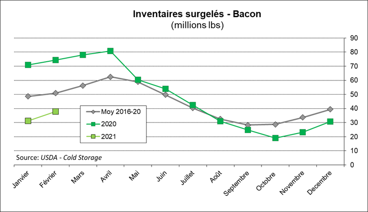 - Bacon : toujours très bas (-49% vs 2020), mais la reconstruction des inventaires progresse bien (+22%).