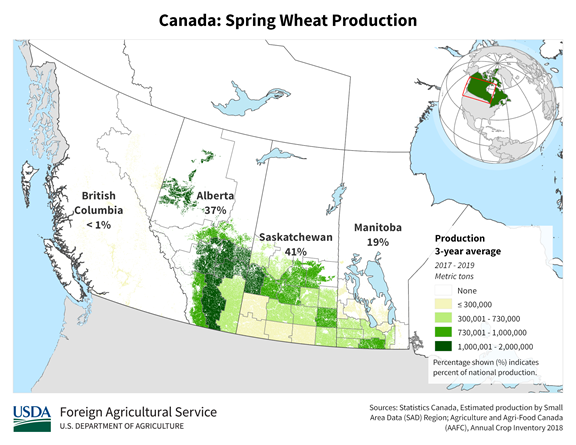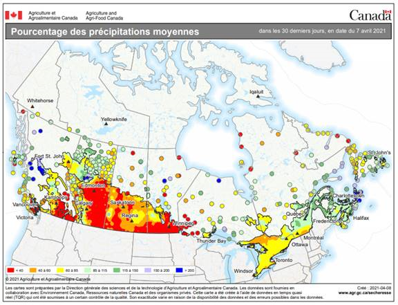 Carte de précipitations au Canada (en % de la normale). Sécheresse dans l’ouest pour le blé?