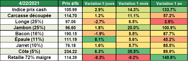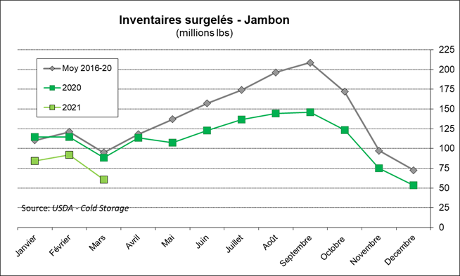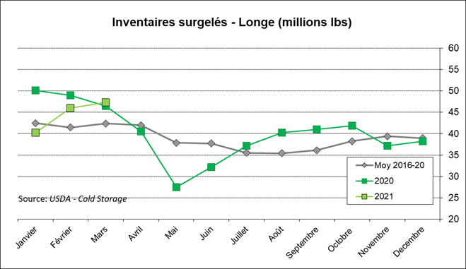 Les inventaires de bacon sont très faibles (-55% vs 2020) ce qui est très favorable pour le prix considérant la forte demande estivale qui est à nos portes. L’ensemble des coupes de porc sont environ 30% en-dessous des quantités de l’an dernier, à l’exception du la longe de porc qui est stable à près de 50 millions lbs.