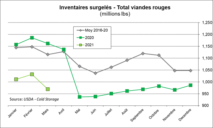 Hier, l’USDA publiait le rapport mensuel des inventaires surgelés. Alors qu’on parlait d’une reconstruction des inventaires surgelés en 2021, particulièrement dans le porc, le rapport nous démontre le contraire. En plus de revoir les stocks du 28 février à la baisse, les inventaires surgelés au 31 mars affichent une diminution mensuelle pour le porc et le bœuf, il y a seulement les inventaires de volaille qui ont resté stables durant le mois de mars.
