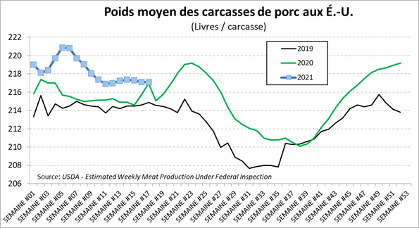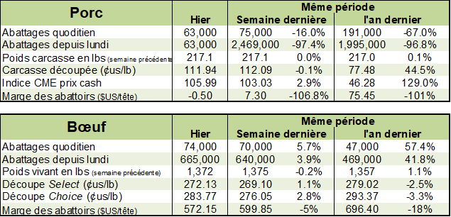 Du côté des abattages, il ne manque pas de viande. La production de bœuf totalisait 550 millions de livres tandis que la production de porc étaient de 537 millions de livres, tous deux largement au-dessus des volumes de l’an dernier. Il faut dire que la production en avril 2020 était faible à cause de la fermeture des abattoirs et pas à cause d’un manque d’animaux. Toutefois, même en comparant à 2019, la production est 5% plus élevée, principalement en raison des abattages (2.47 millions de porcs et 665,000 bœufs).