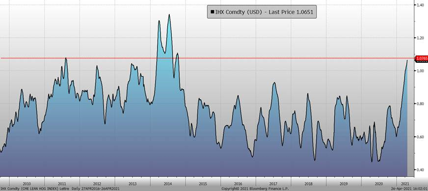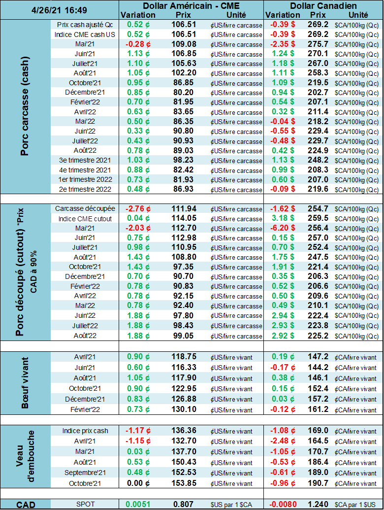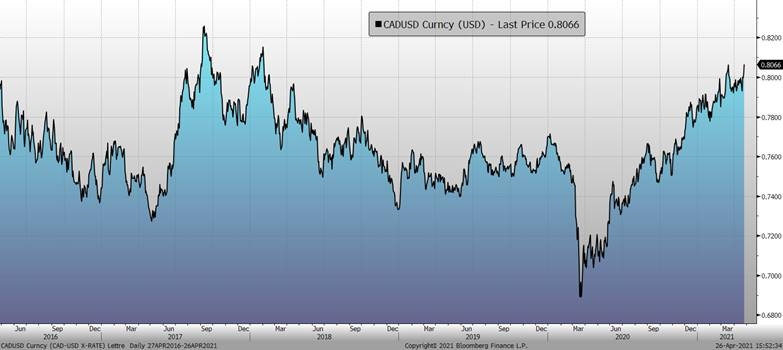 Cependant, le dollar canadien remonte près de son sommet de mars et s’approche du haut des 5 dernières années ce qui affaiblit le prix du porc en dollar canadien. Le fait que la Banque du Canada ait annoncé une réduction de l’assouplissement quantitatif (autrement dit, imprimer de l’argent) de 4 à 3 milliards par semaine est perçu positivement sur le marché des devises puisque le Canada est le premier pays à resserrer ses politiques monétaires. De plus, les projections de croissance pour 2021 ont été augmenté de +4.0% à +6.5%, notamment grâce au secteur des matières premières.