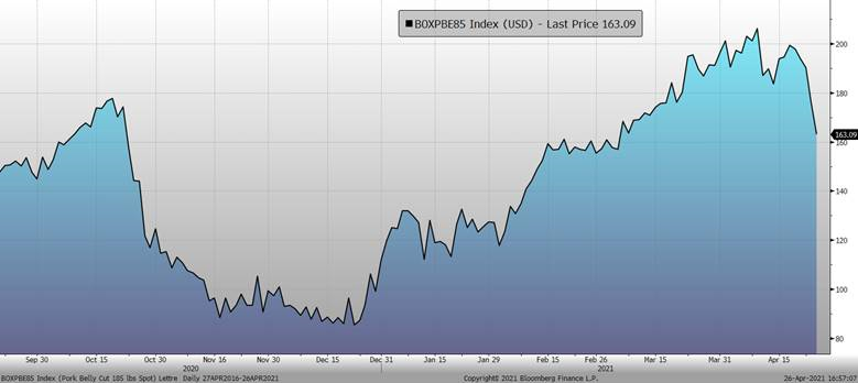 On garde un œil de près sur le marché des découpes de porc qui a perdu 5 cents/lb depuis 2 jours, principalement à cause du prix du bacon. La marge des abattoirs était estimée à -9 $US/tête avant les données d’aujourd’hui, on va donc commencer à s’approcher de niveau record concernant les pertes des abattoirs… il se pourrait qu’on commence à voir les abattoirs être moins agressif sur les achats de porcs vivants.