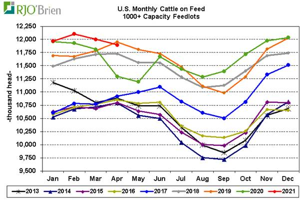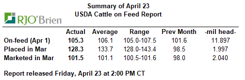 Vendredi en après-midi, il y avait la publication du rapport mensuel Cattle-on-Feed dévoilant le nombre de bœuf en parc d’engraissement. La quantité de bœuf en parc au 1er avril est inférieur aux attentes à 11.9 millions têtes, soit 5.3% de plus que l’an dernier (estimé à +6.1%). Les placements ont été plus faibles que prévus à 2 millions de veaux. Ce rapport aurait dû être positif pour les prix, mais les contrats ont ouvert à la baisse et ce sont légèrement appréciés en fin de journée.
