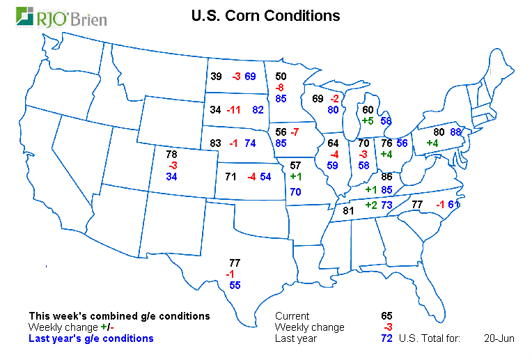 - Conditions du maïs 65% bonnes/excellentes vs 64% attendues (64-67% éventail d'idées), 68% la semaine dernière, 72% l'année dernière